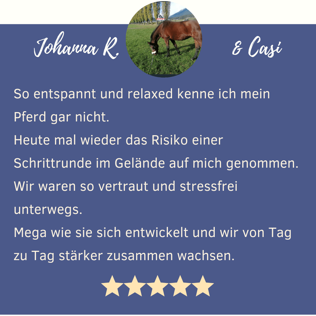 “Mein Pferd ist sehr introvertiert und wartet immer darauf aus der Herde geholt zu werden. Gestern kam mein Pferd direkt zu mir, ein so schöner Moment. Ich bin mir sicher, dass ich das den Veränderungen in mir durch diese Gruppe verdanke" ✨ Tanja