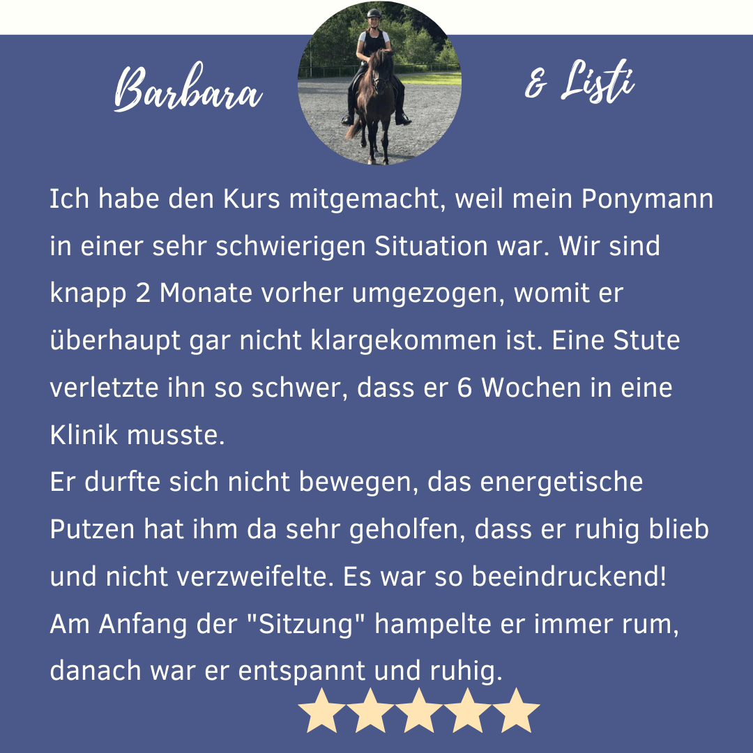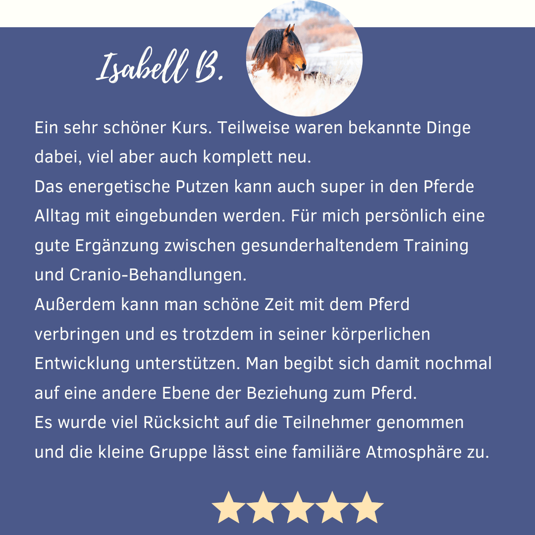 Die Teilnehmer meiner Online-Kurse berichten auch bei traumatisierten Pferden und einer schwierigen Ausgangslage immer wieder davon, dass sich die Pferde viel besser anfassen lassen und sich Themen lösen mit denen sie nicht gerechnet haben. Es lohnt sich also mit der Energetik anzufangen.